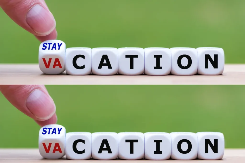 Staycation cocok untuk libur singkat 1–2 hari. Vacation memerlukan waktu lebih lama karena melibatkan perjalanan, biasanya 3 hari hingga seminggu atau lebih.